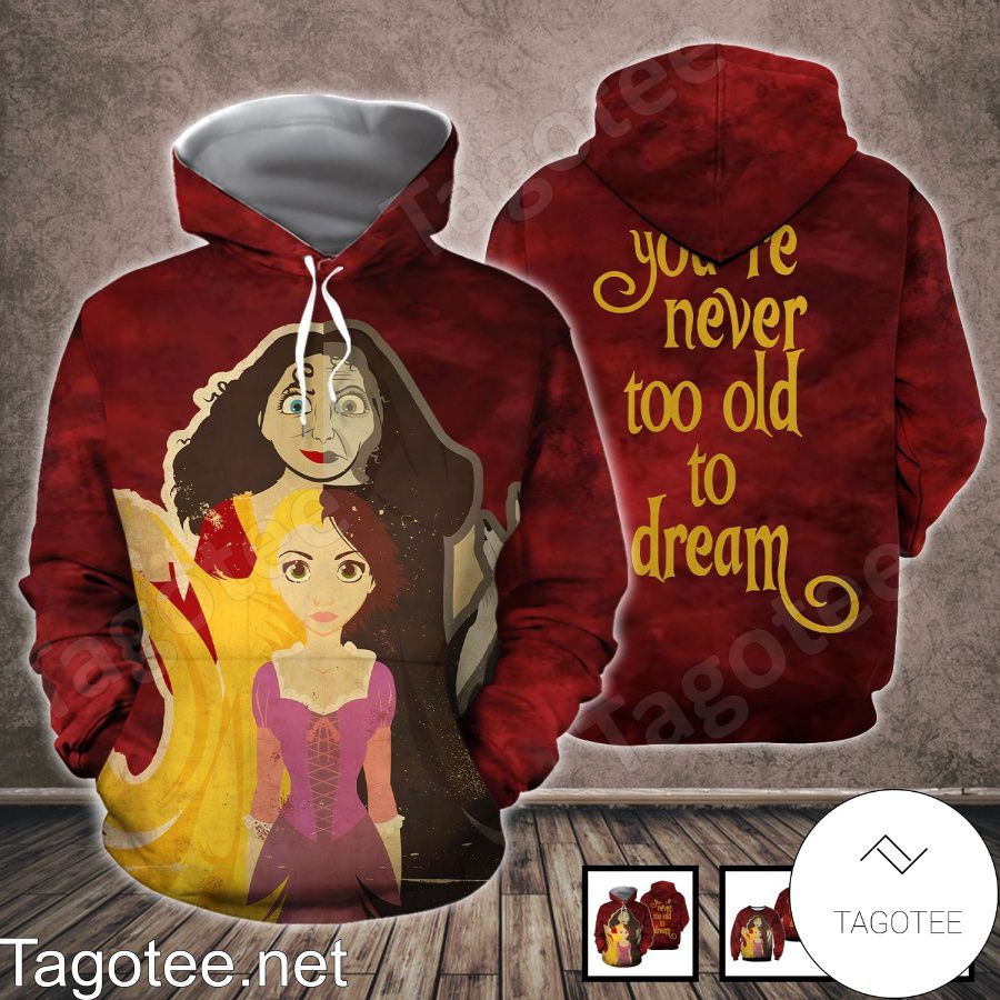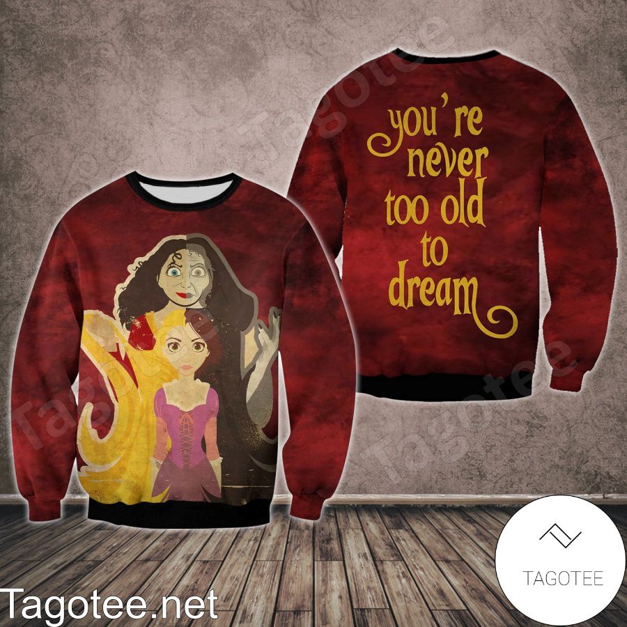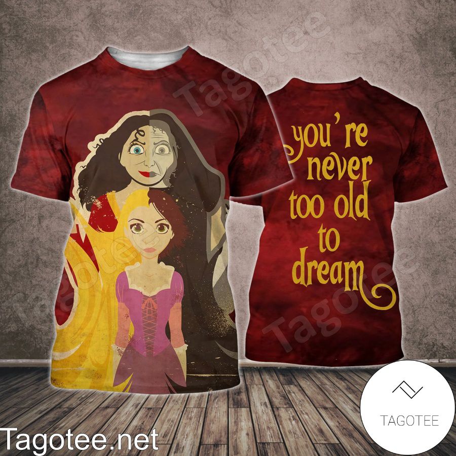 - Rapunzel And Gothel You're Never Too Old To Dream Shirt, Tank Top And Leggings is your go-to top for work, school, casual fashion, and beyond. It’s the perfect complement for practically any business or work dress code, school uniform, and daily wardrobe.
